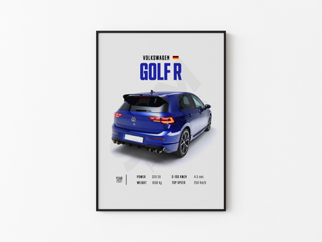 كادر يعرض أيقونة التميز والرياضية، Golf 8R. تصميم يجسد القوة والأناقة اللي تعودنا عليها من فولكسفاغن. الأبعاد: A4 [30x21 سم].